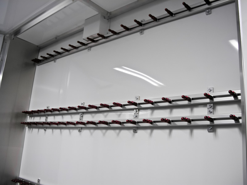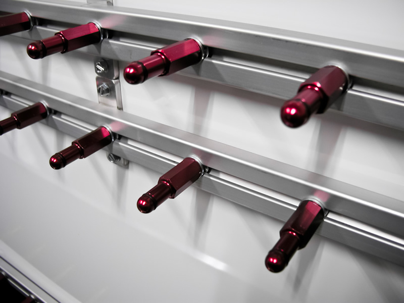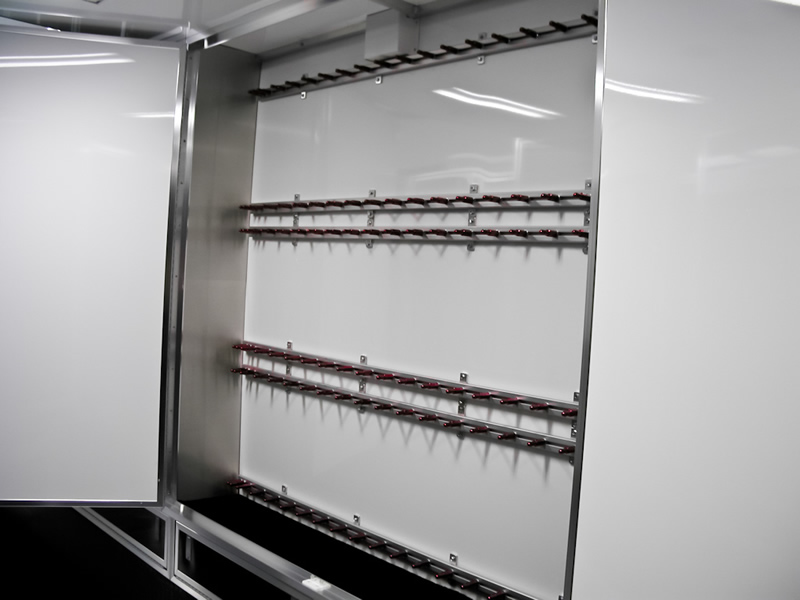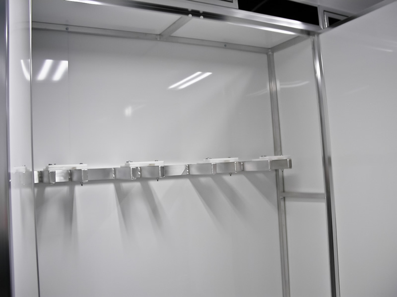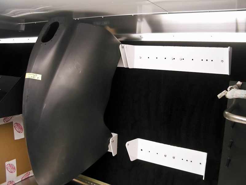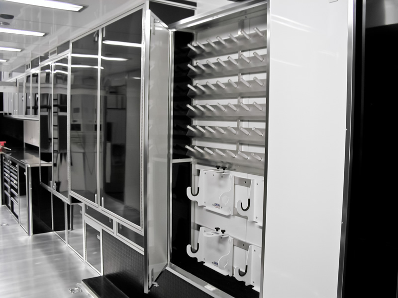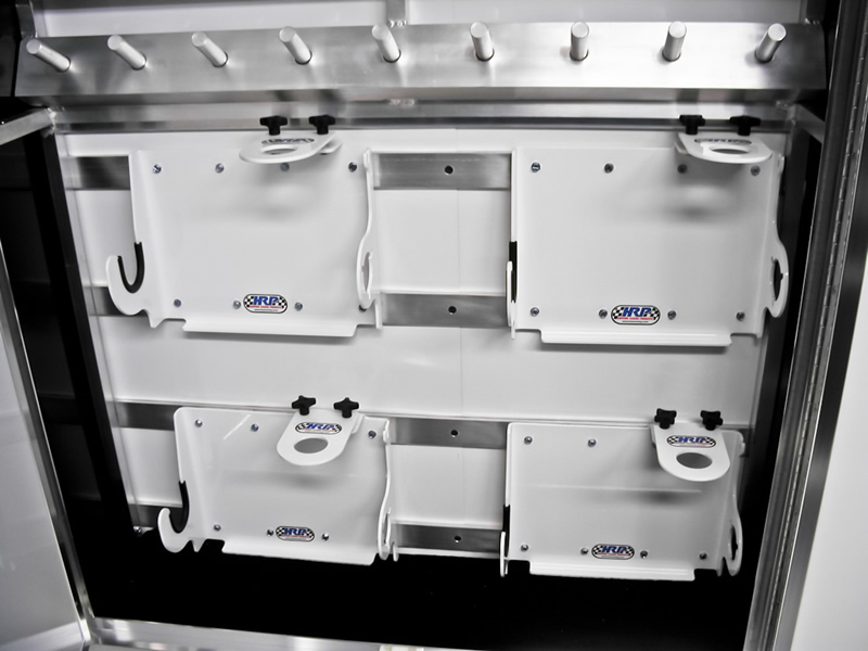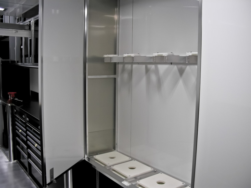 Note: T&E can custom build your cabinet interiors to hold a wide variety of racing equipment. Pictured above is a gear rack cabinet with holders for various sizes of gears. We also offer front and rear end racks, shock racks, fuel jug racks and many other specialized types of equipment storage options for our custom cabinets |