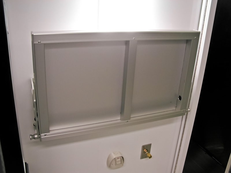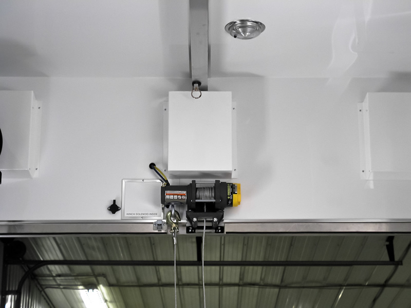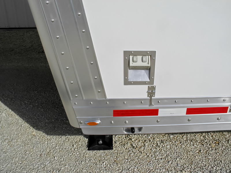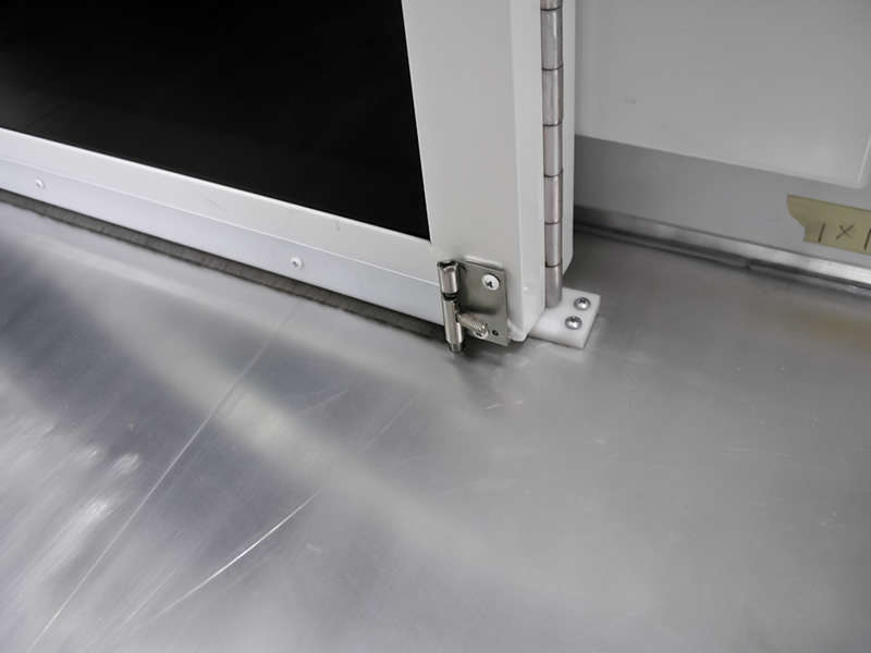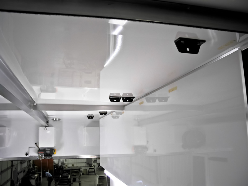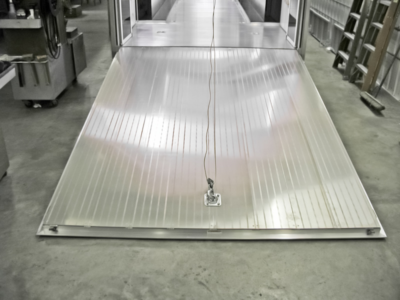 Note: T&E offers a wide variety of entry and ramp door options for trailers with air conditioning installed. Pictured above is a special custom made full height bi-fold door with clear plexi-glas panels mounted at the rear ramp door of a trailer. We also offer strip curtains as well as sliding or swinging glass door options. |