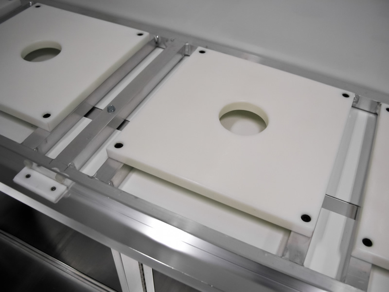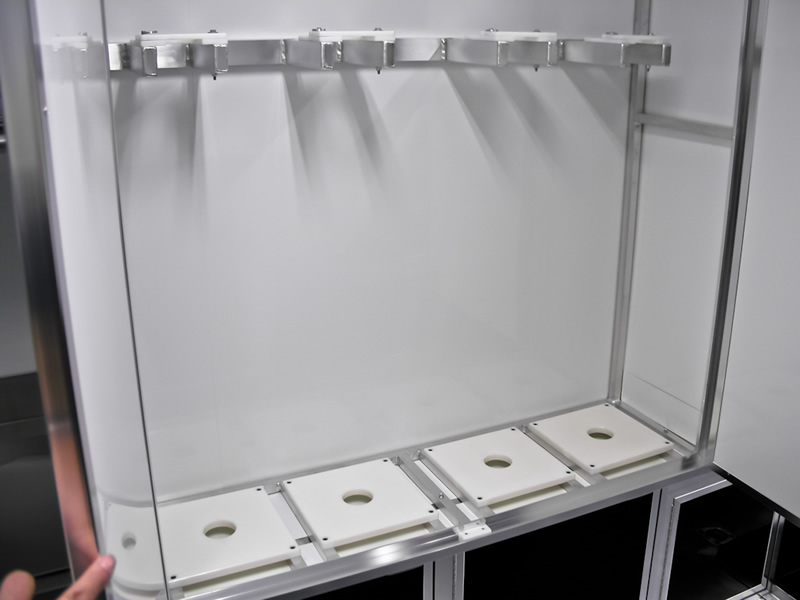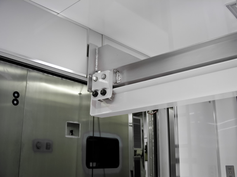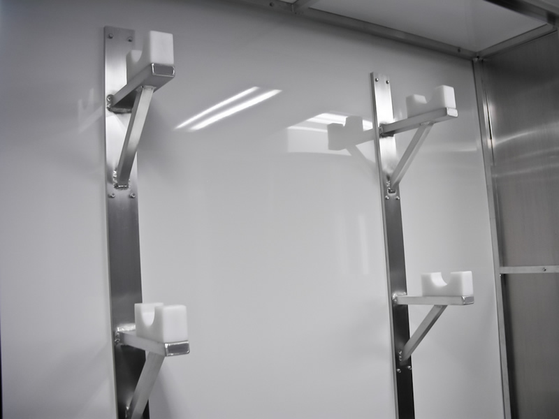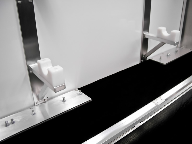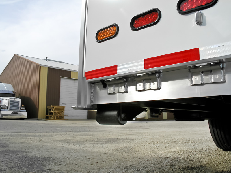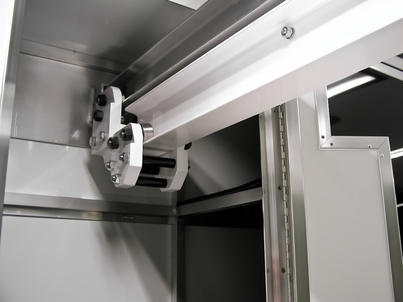 Note: T&E offers a wide variety of entry and ramp door options for trailers with air conditioning installed. Pictured above is a special custom made full height bi-fold door with clear plexi-glas panels mounted at the rear ramp door of a trailer. We also offer strip curtains as well as sliding or swinging glass door options. |