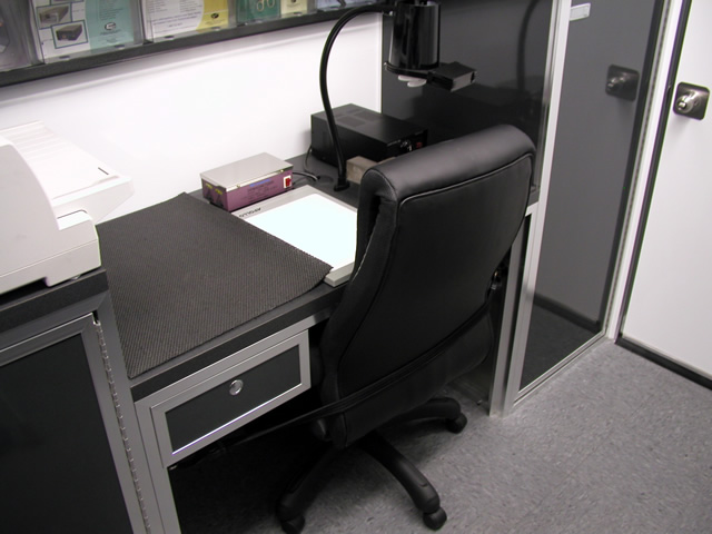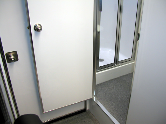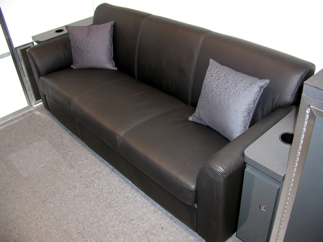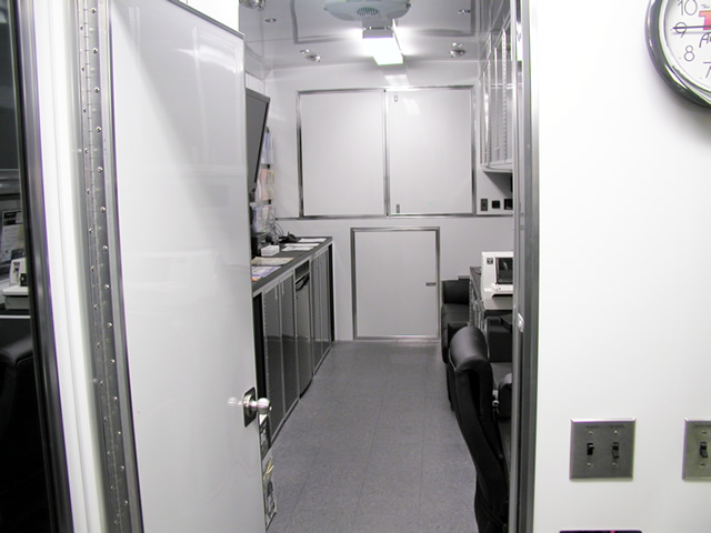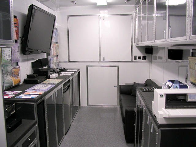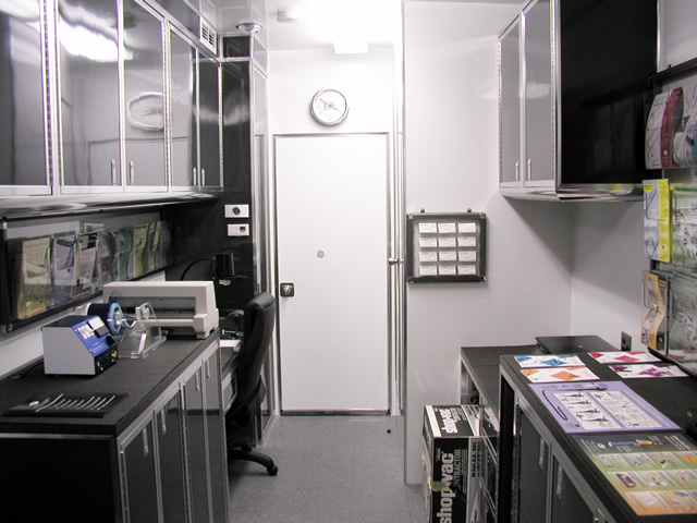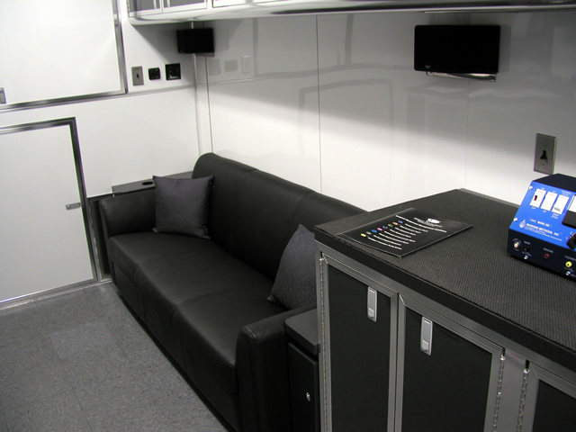 The front office/living area of the trailer features all the amenities needed to both conduct Brent's daily business activities and also to afford him a place to relax after working hours. In addition to the office desks and other related items, there is a large leather sofa with an HD LCD monitor directly across from it. Brent can relax and enjoy his favorite television programs via the on board satellite system, watch a favorite movie in full HD 1080 clarity via Blu-Ray or listen to his favorite music through the high powered stereo system. There is even a fully equipped bathroom w/shower and a special Incinolet toilet system which doesn't require water or a related sewage tank. To visualize what T&E is capable of, please take a moment to tour through Brent's trailer via the photo galleries below. [A PDF Photo Pack is also available for offline viewing.]