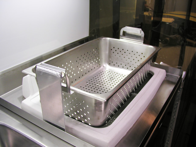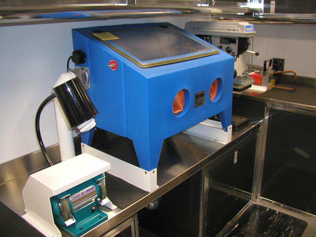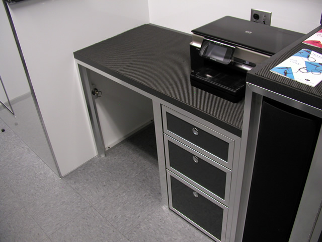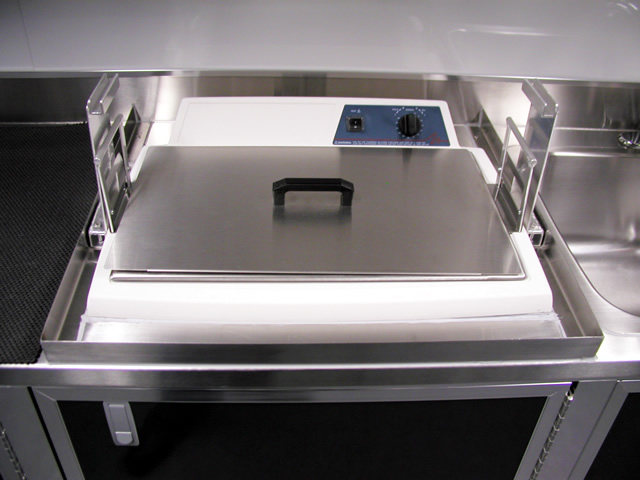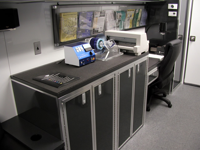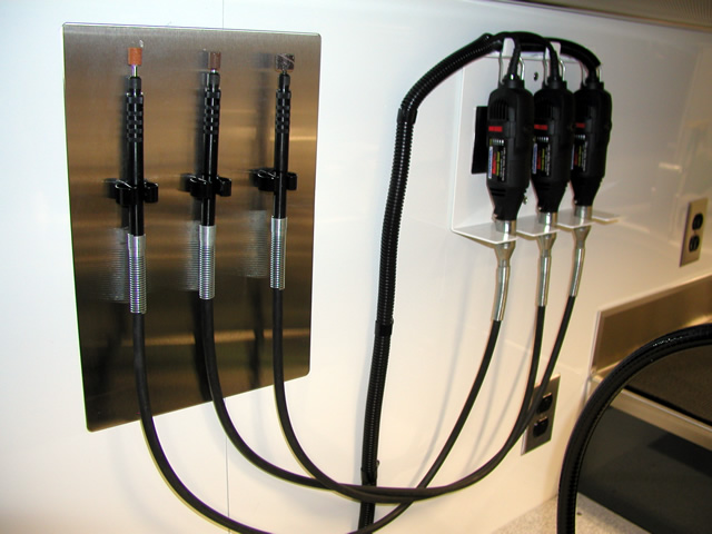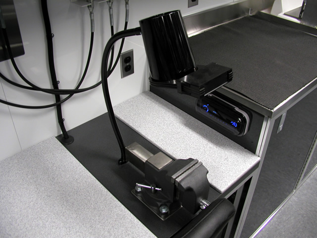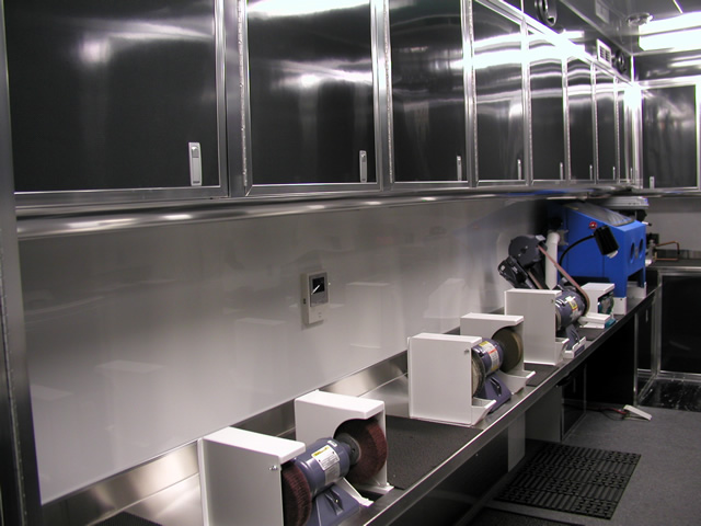 The rear portion of the trailer is a fully equipped surgical instrument repair shop which houses all the specialty tools and equipment that Brent needs to perform his daily work. The fully climate controlled work area also features a JET air filtration system to filter contaminants from the air. Under the main work bench T&E custom built a high powered vacuum system with suction tubes running up to each tool to ensure that debris from the tool restoration processes is contained properly. To make the long days at work more enjoyable, there is a high powered multi-speaker stereo system installed within one of the benches in the work area.