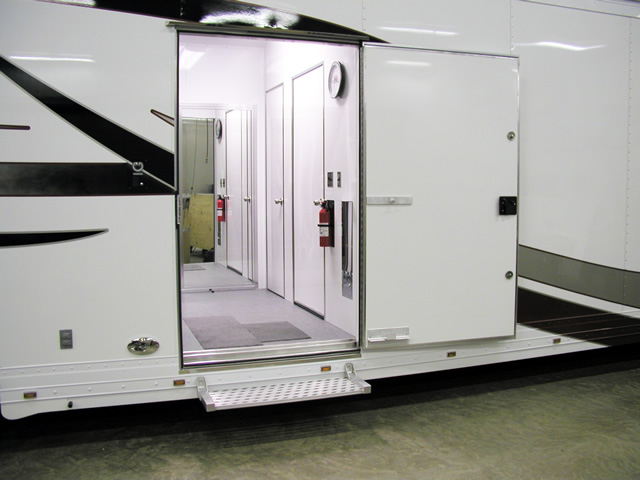T&E recently built this 53' Gooseneck Trailer for Brent Kolada who travels around the U.S. and Canada with a mobile on-location surgical instrument repair service. Brent wanted his trailer to be a combination mobile business and RV due to the fact that he is on the road for long periods of time traveling to various medical facilities throughout the year. The trailer features separate work and office/living areas and allows Brent to be highly productive in his business travels. Brent put a lot of personal research and planning into exactly what he needed in a trailer and T&E worked closely with him and successfully brought those plans to fruition.